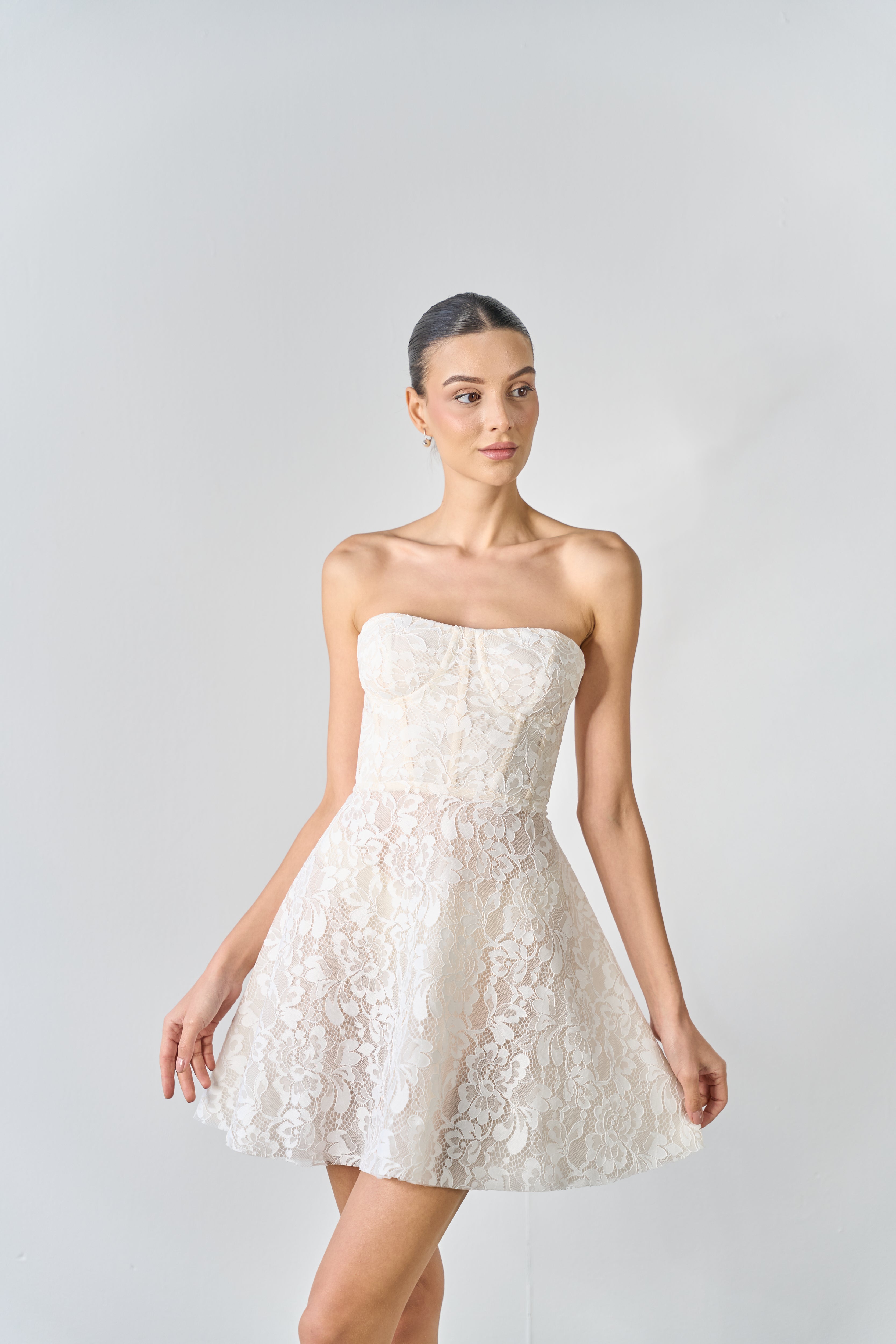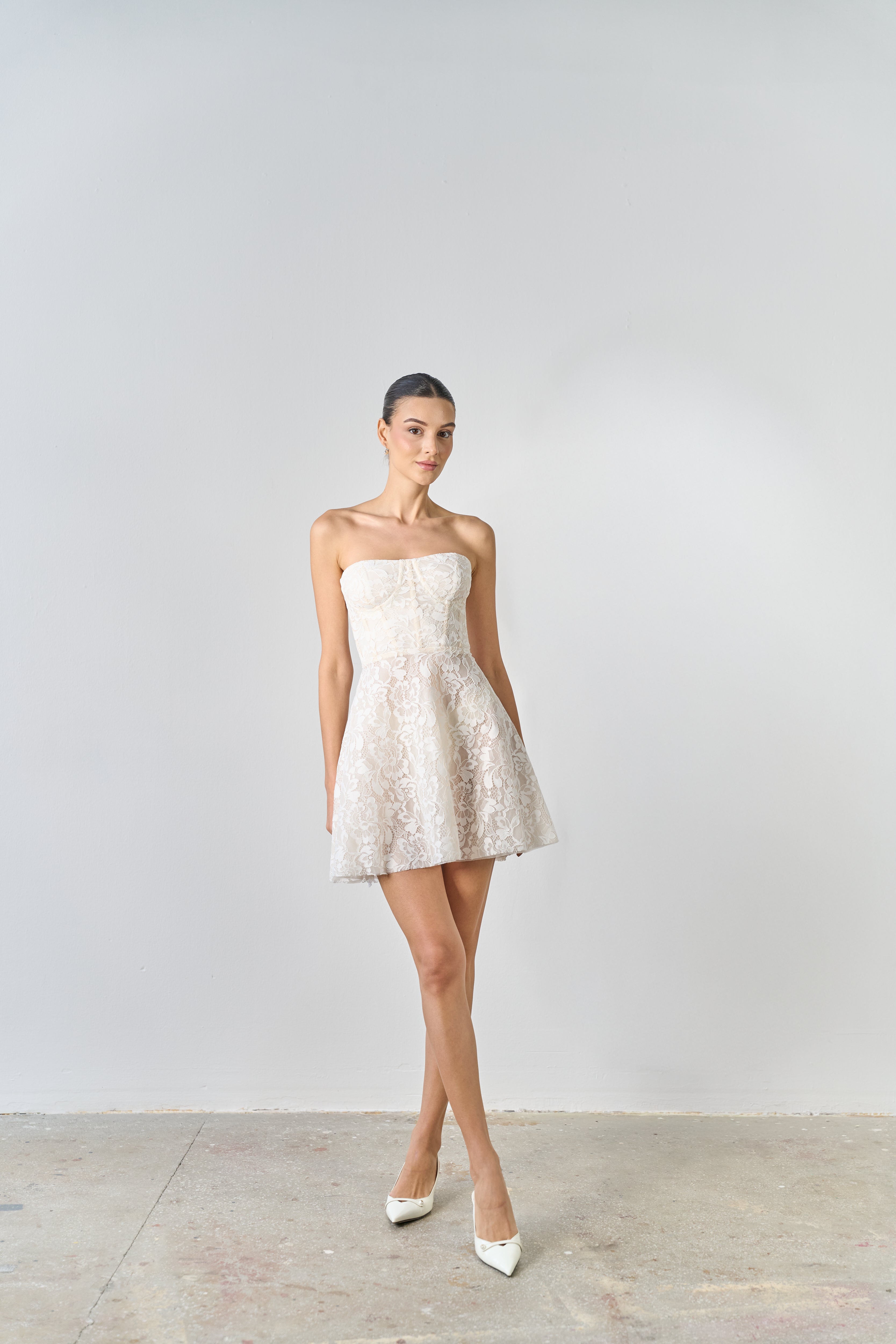 A romantic lace mini featuring a sculpted strapless bodice, flared skirt, and airy structure, delivering a refined, feminine silhouette with effortless bridal elegance.