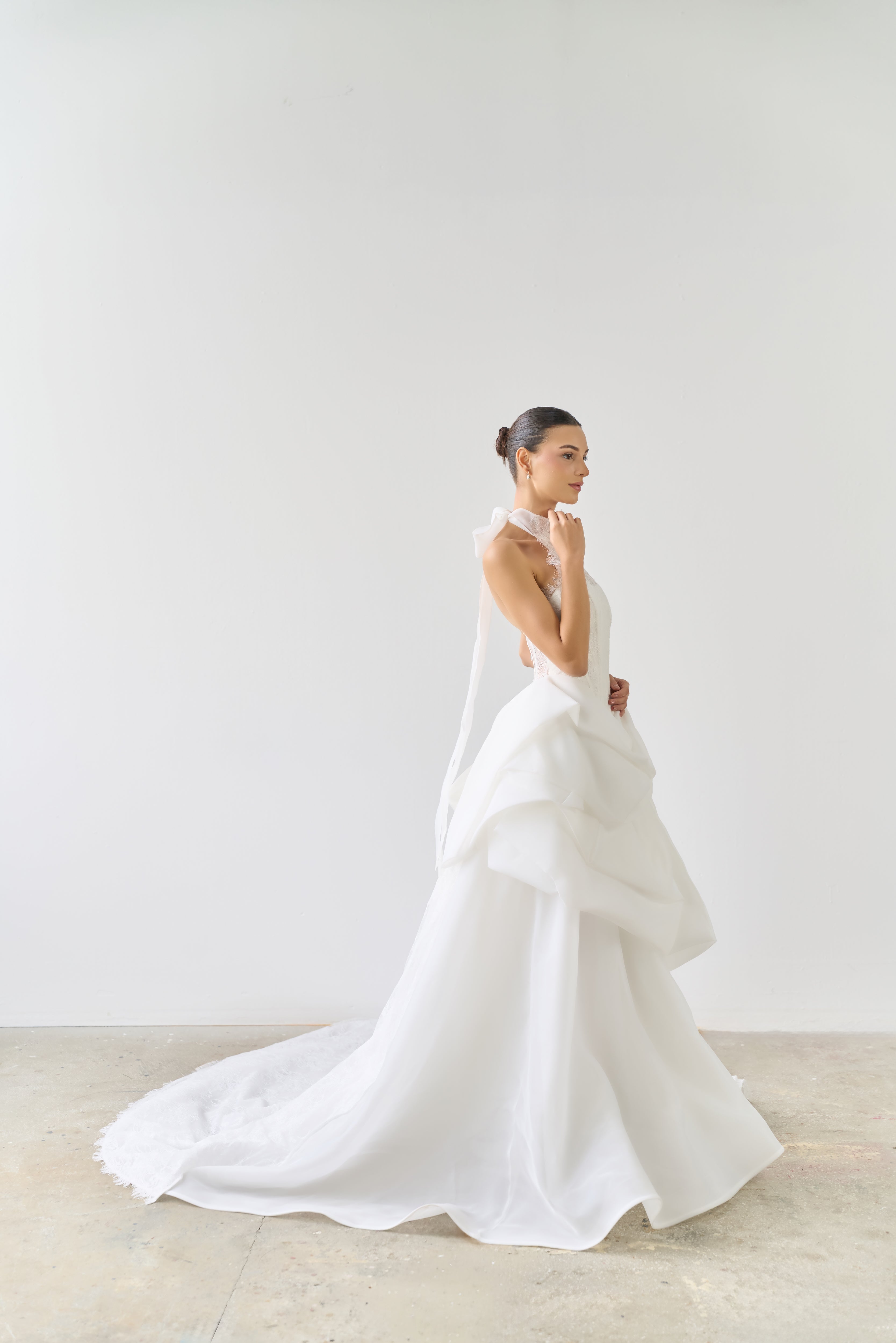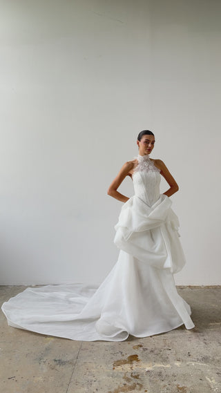 A sculpted couture gown featuring an intricate halter neckline, a fitted bodice, and a dramatically draped voluminous skirt. Its architectural silhouette creates an effortlessly regal, gallery-worthy bridal look.