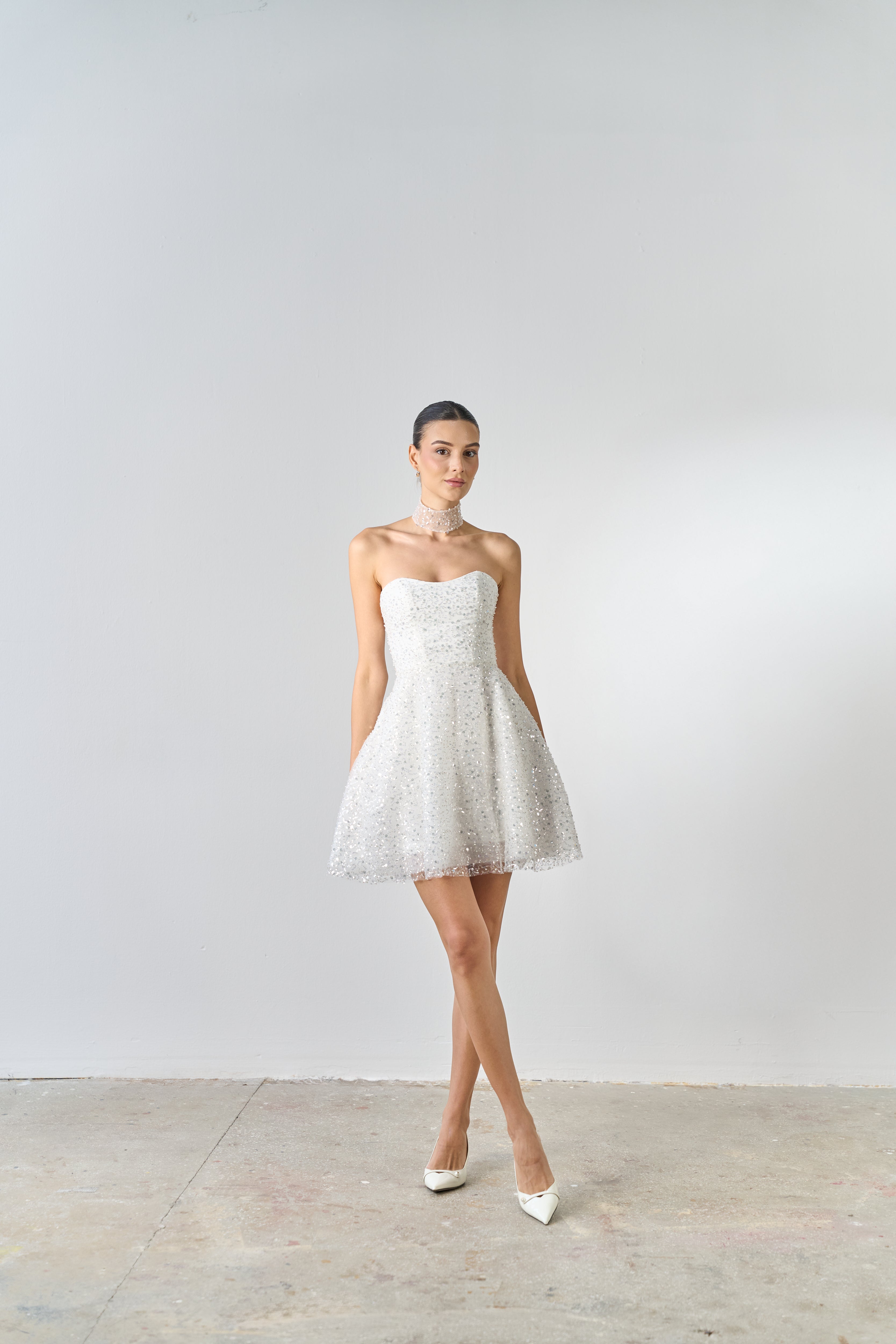 A radiant couture mini featuring a sculpted strapless bodice and shimmering beaded detailing. Delivering an elegant, body-defining silhouette with show-stopping movement.