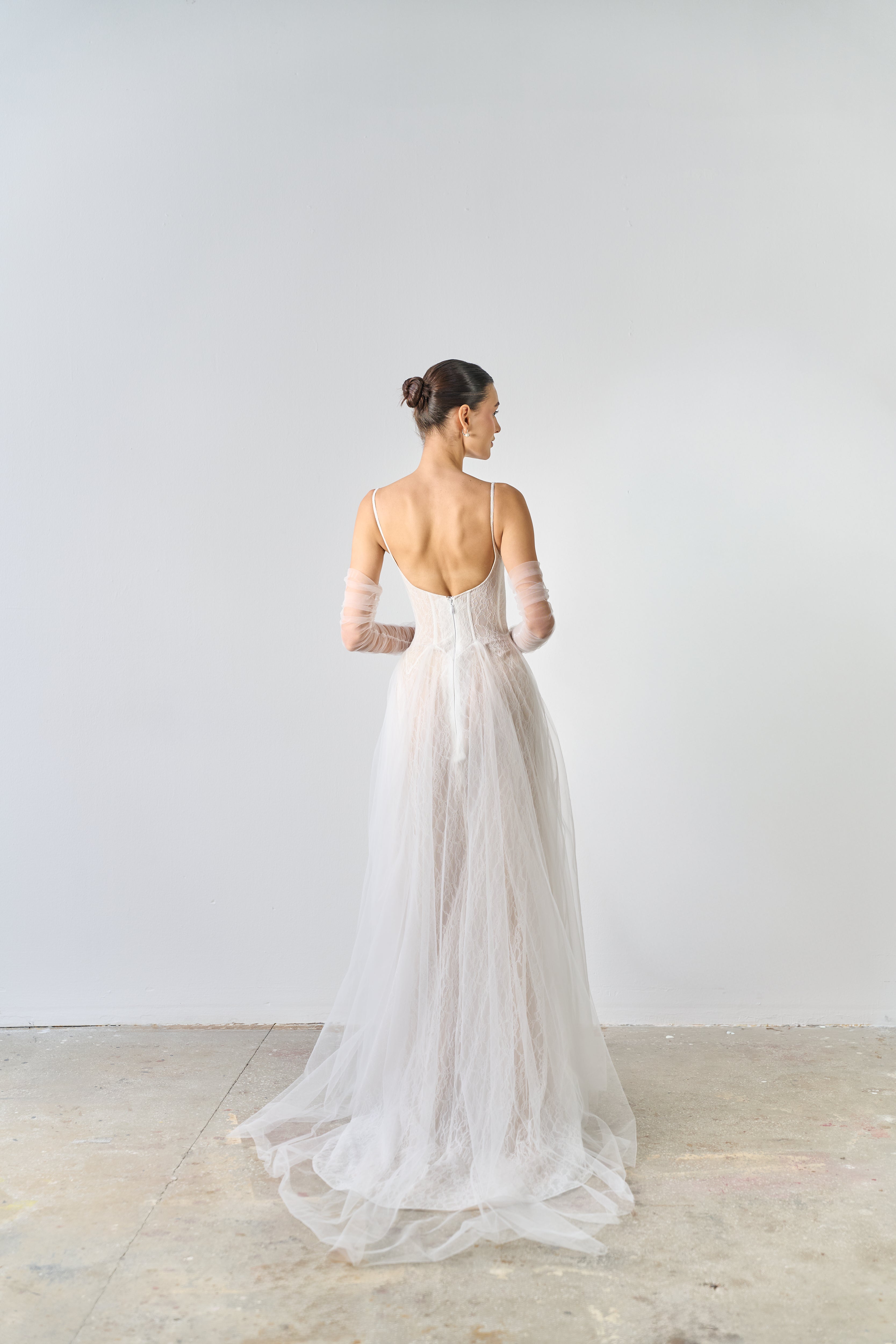 The Starry illusion corset dress unveils a sheer lace bodice with defined boning and a billowing layered skirt, shaping an ethereal A-line silhouette with a delicate sweetheart neckline and airy, romantic movement.