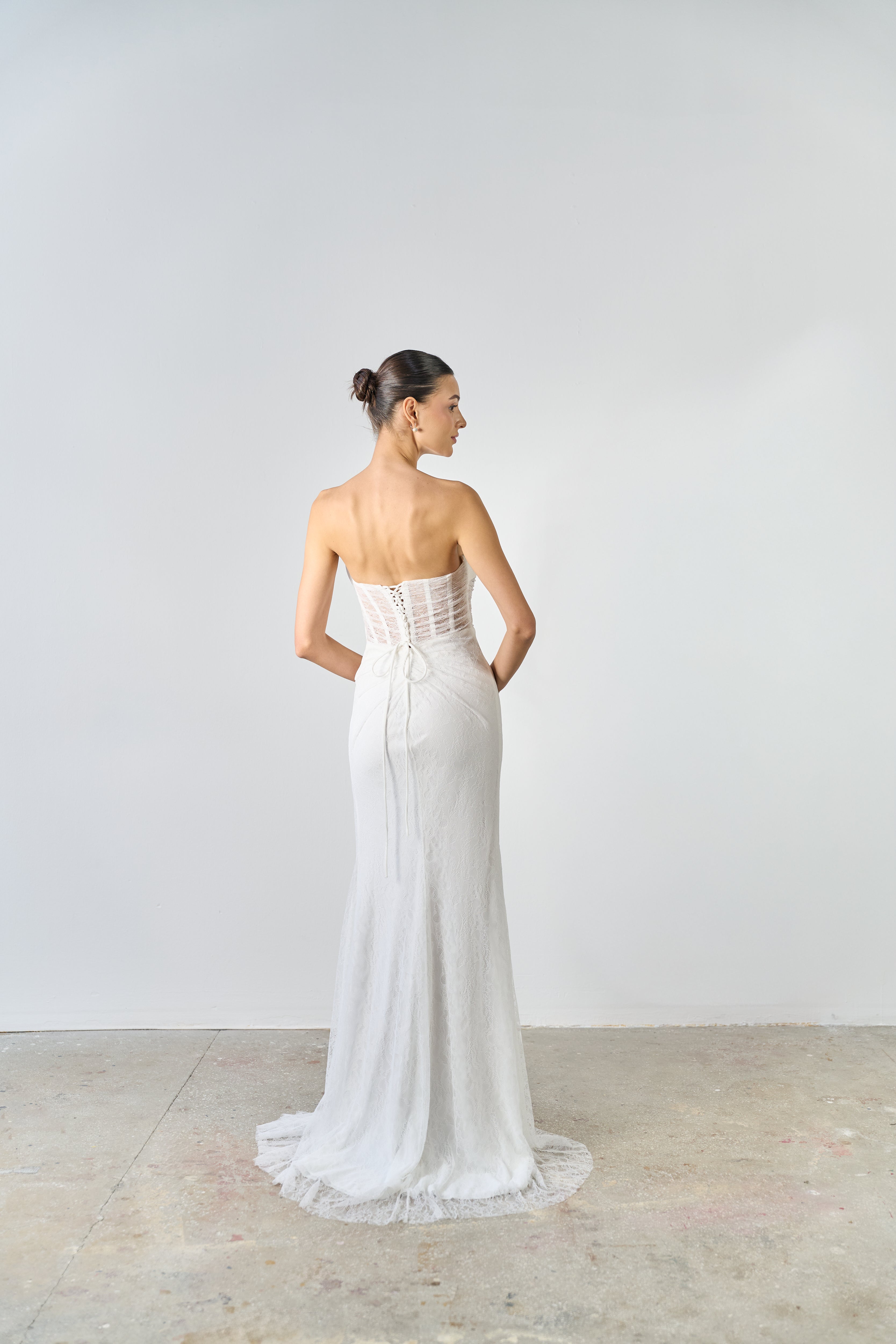 A sculpted column gown featuring an asymmetric corset neckline and fluid draped contour, delivering a refined, body-enhancing fit with an effortlessly modern, elevated presence.