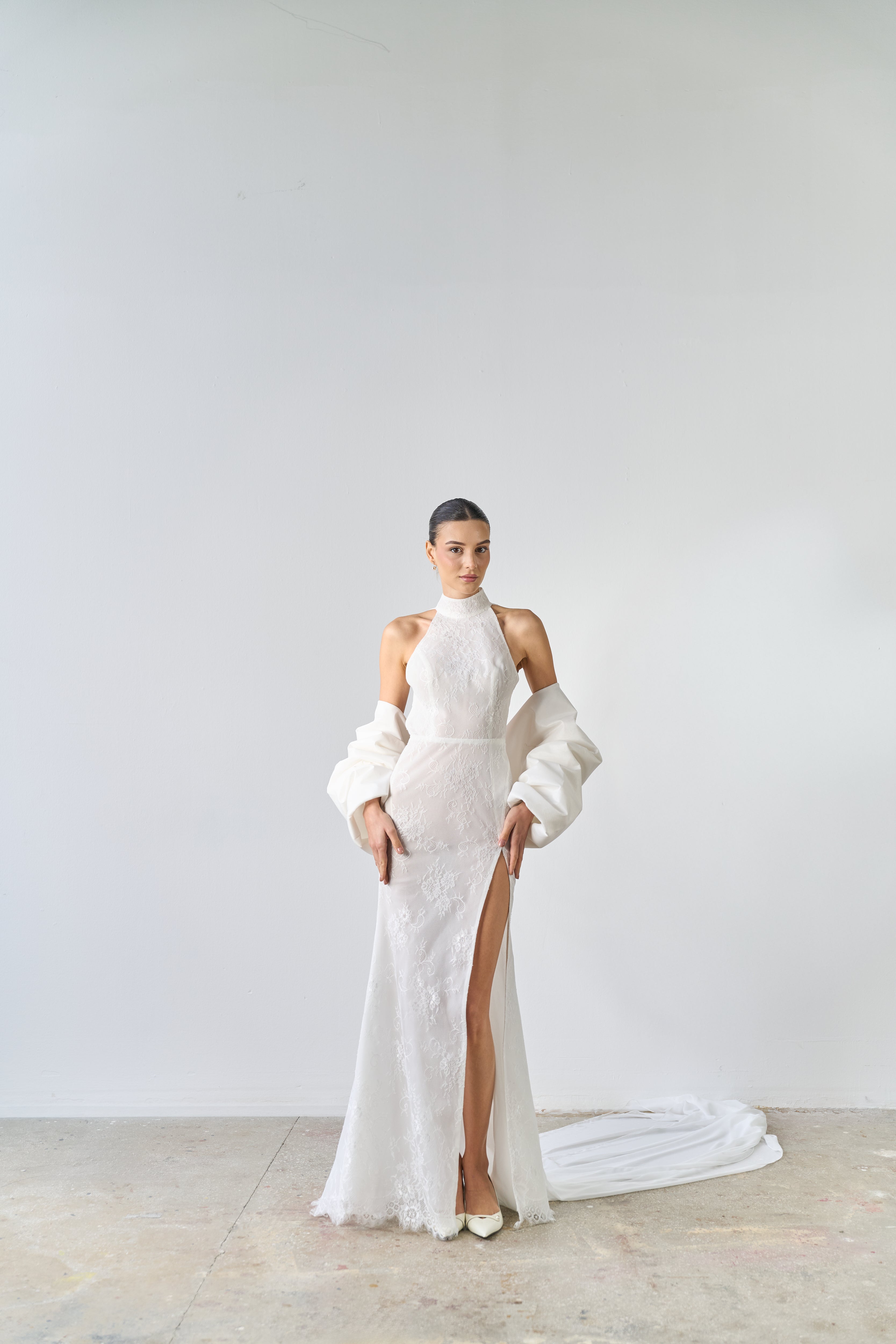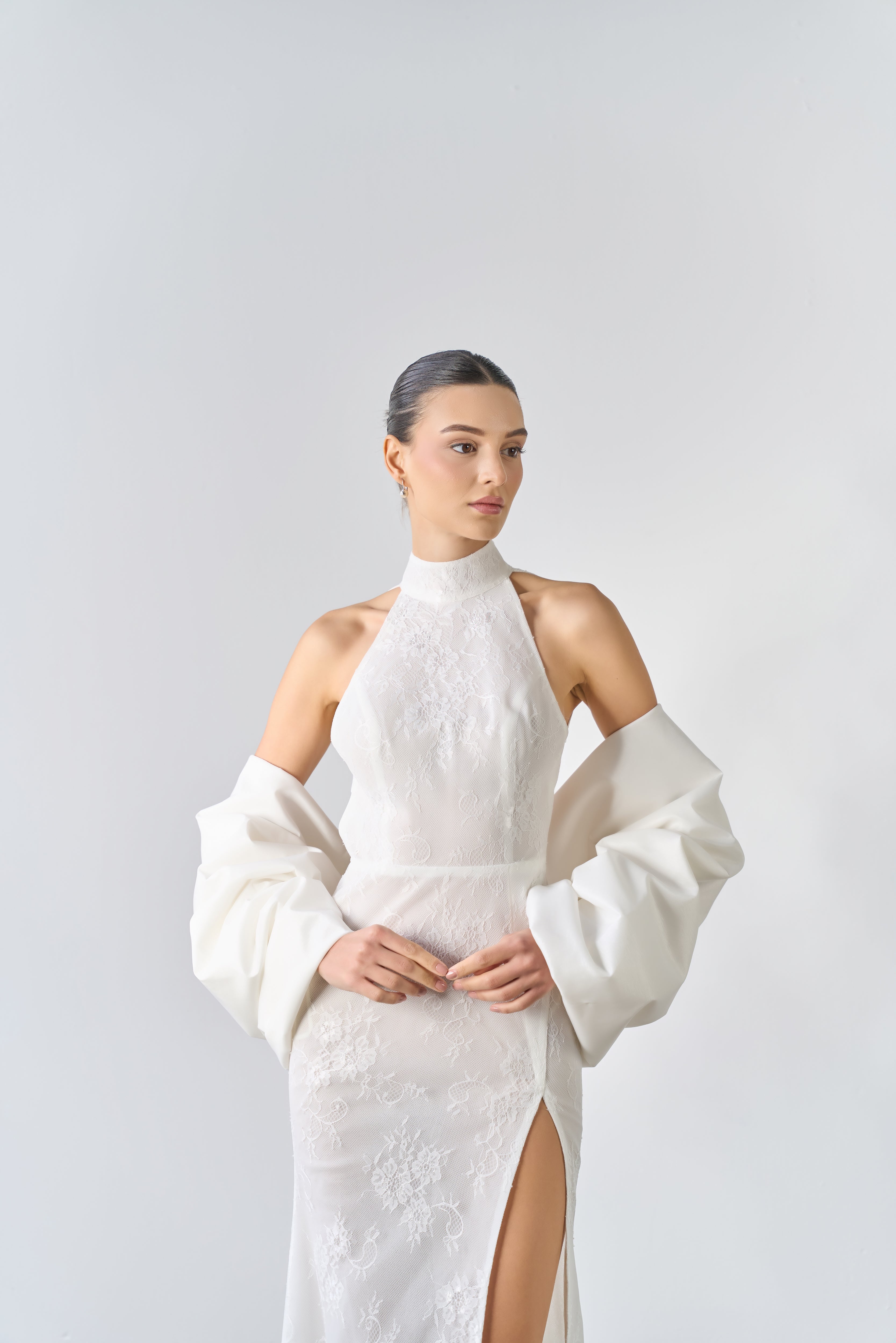 A sculpted column gown featuring a refined halter neckline and sleek sleeveless bodice, designed to contour the figure with modern elegance and a fluid, elongating silhouette.