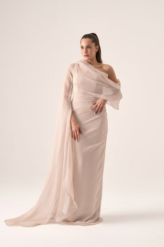 The Pemma gown features an elegant column silhouette with an asymmetric neckline and an off-shoulder draped sleeve design. This maxi-length gown offers a refined fit, perfect for sophisticated events and formal occasions.