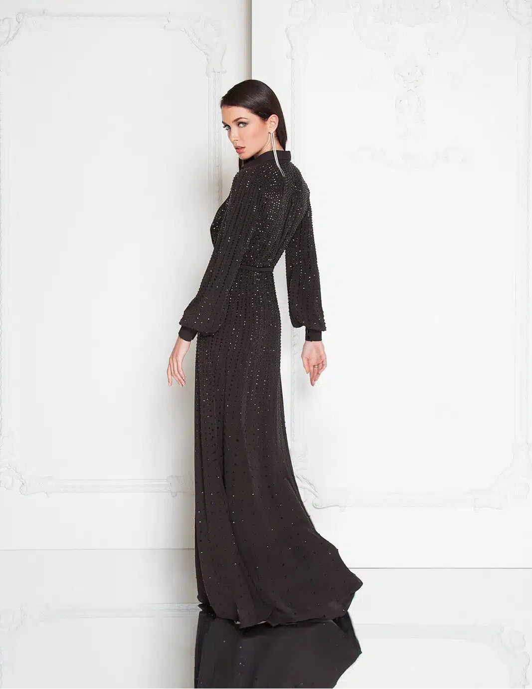 An exquisite floor-length gown featuring a plunging V-neckline, long tailored sleeves, and an elegant high slit. Intricately beaded detailing accentuates its sleek column silhouette for a sophisticated, couture-inspired finish.