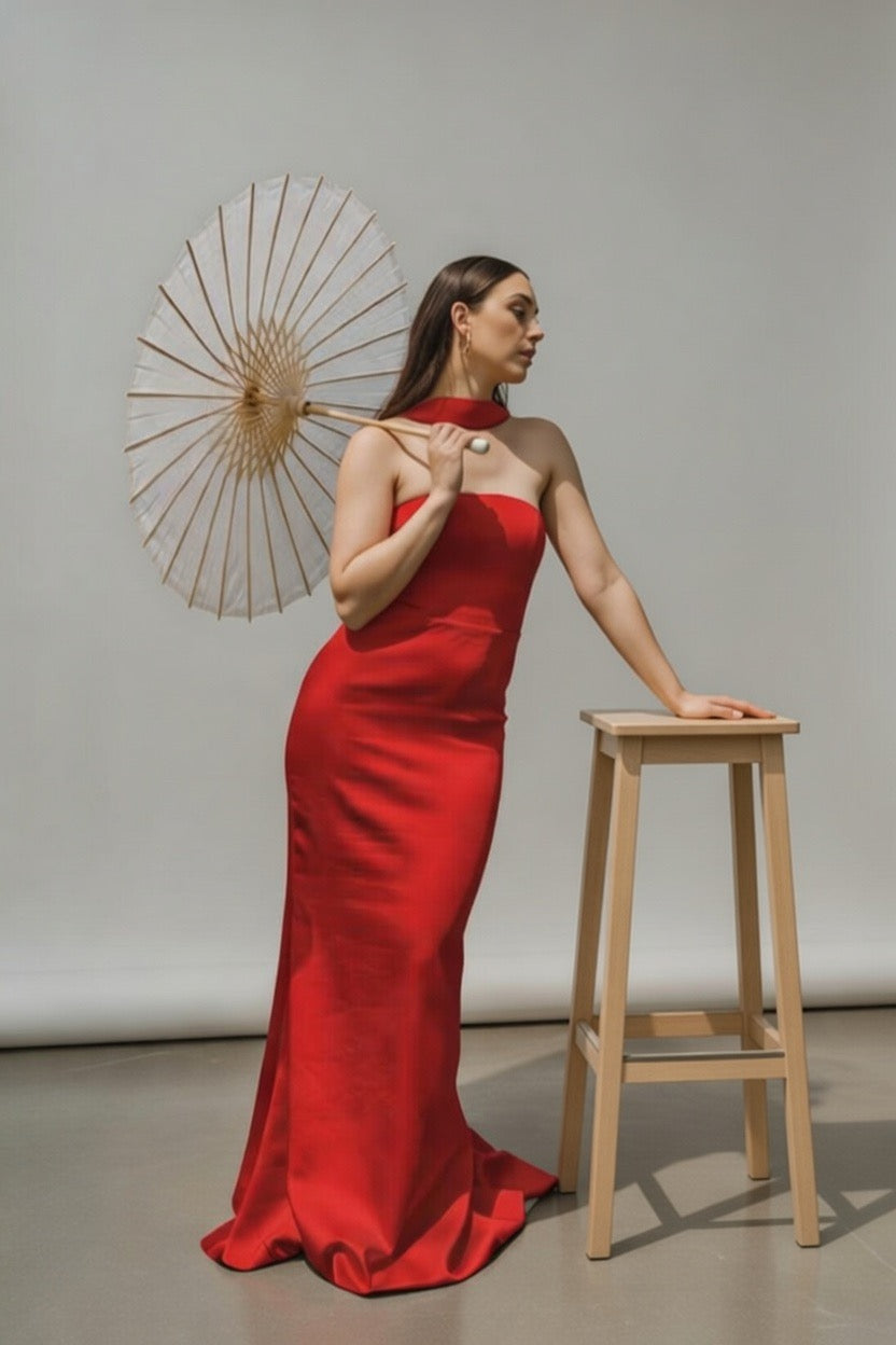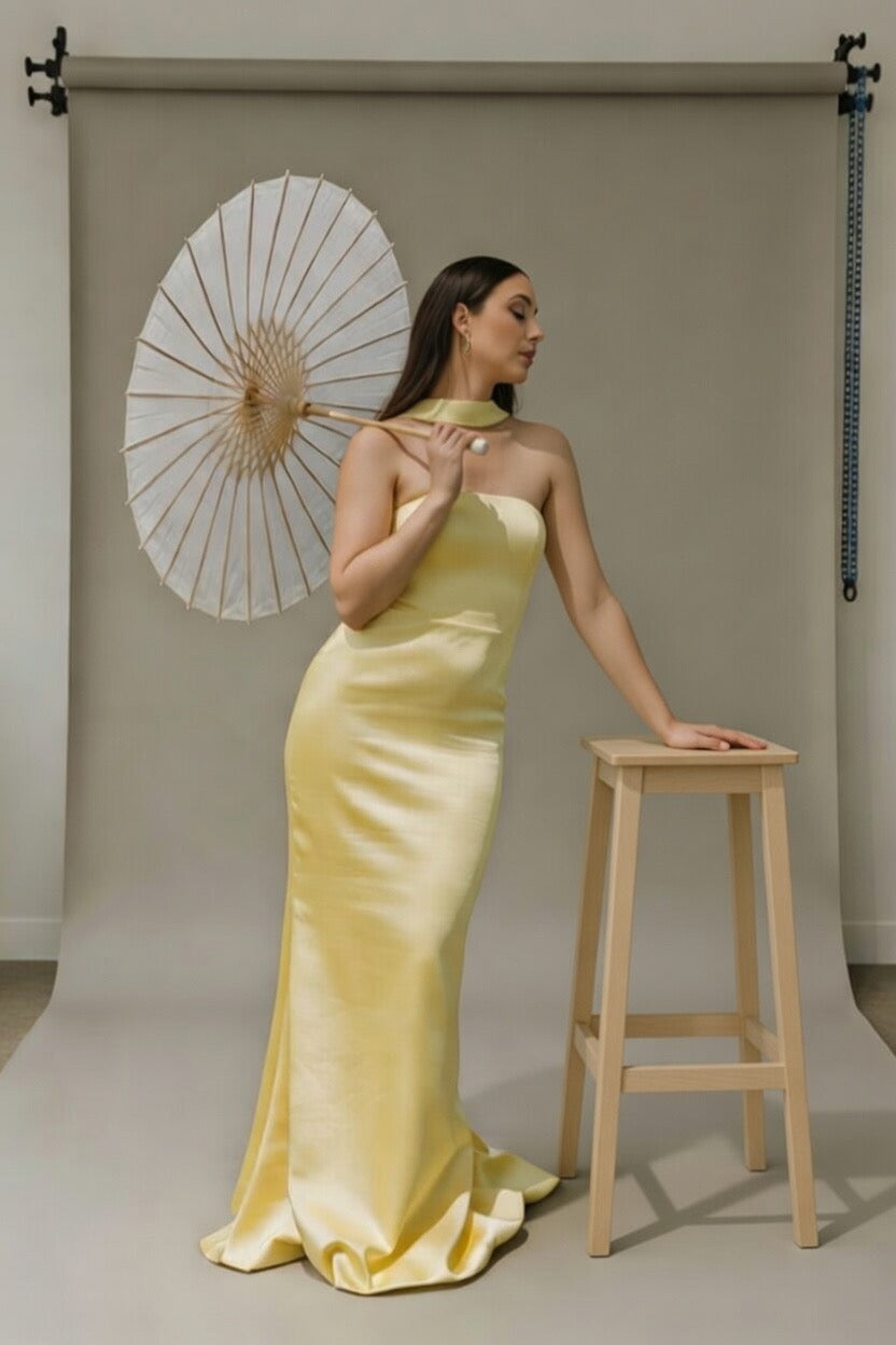 This exquisite strapless gown boasts a sleek, floor-length silhouette that gracefully elongates the form. Designed with a timeless, column cut, it hugs the body elegantly before gently flaring at the base for subtle movement. The straight neckline accentuates the collarbone, creating a refined and sophisticated look perfect for upscale occasions.