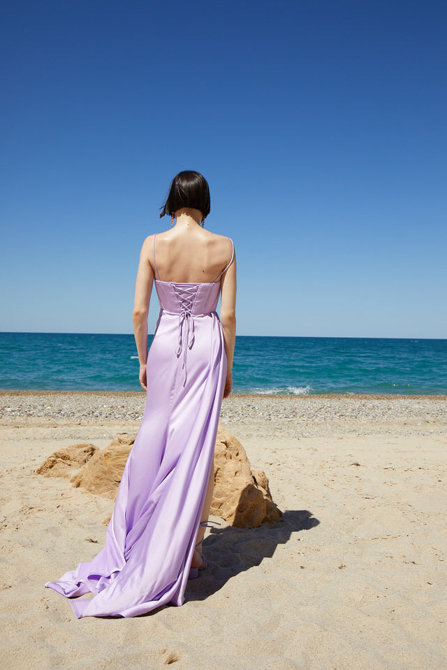 A sculpted maxi design with a sleek column silhouette, delicate draping, a refined straight neckline, and slender straps, creating an effortlessly polished, figure-enhancing finish.
