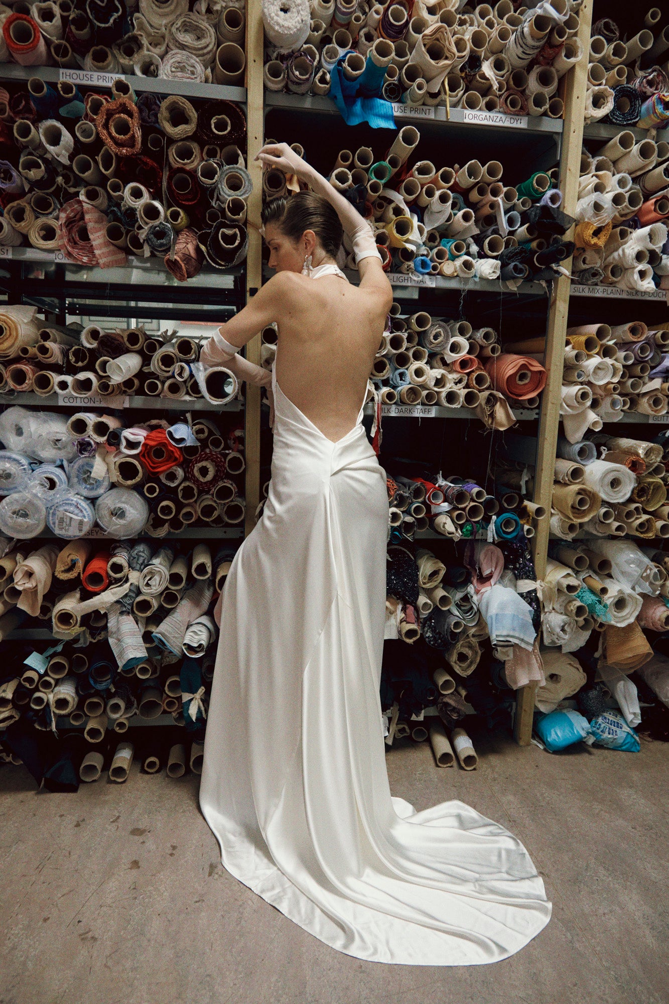 - Inspired by Vivienne Westwood’s legacy of Greco-Roman draping and her signature reinterpretations of unstructured bridal silhouettes