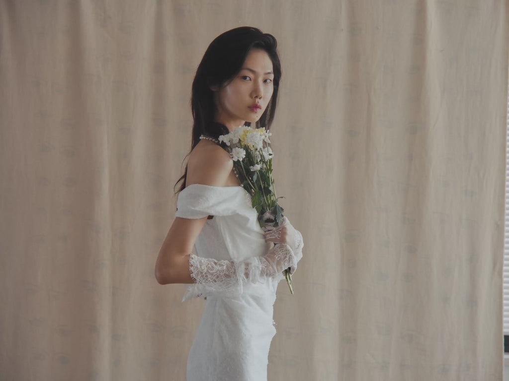 A timeless Vivienne Westwood silhouette, this gown features an elegant off-shoulder Bardot neckline, sculpted corsetry, and a fluid fishtail skirt. Crafted in Chantilly lace, it embodies couture precision and romantic modernity.