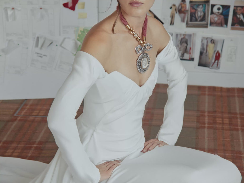 A timeless silhouette showcasing Westwood’s mastery of structure and draping. The strapless gown features a sculpted neckline, clean architectural lines, and a flowing train—pure couture elegance.