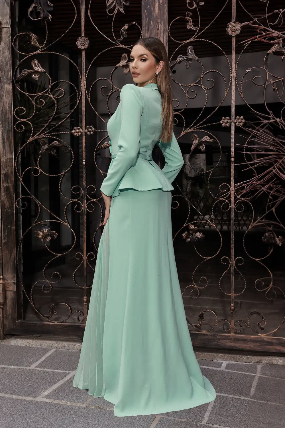 An elegant maxi sheath dress featuring a refined V-neckline, structured long sleeves, and a tailored fit that accentuates the silhouette with modern sophistication.