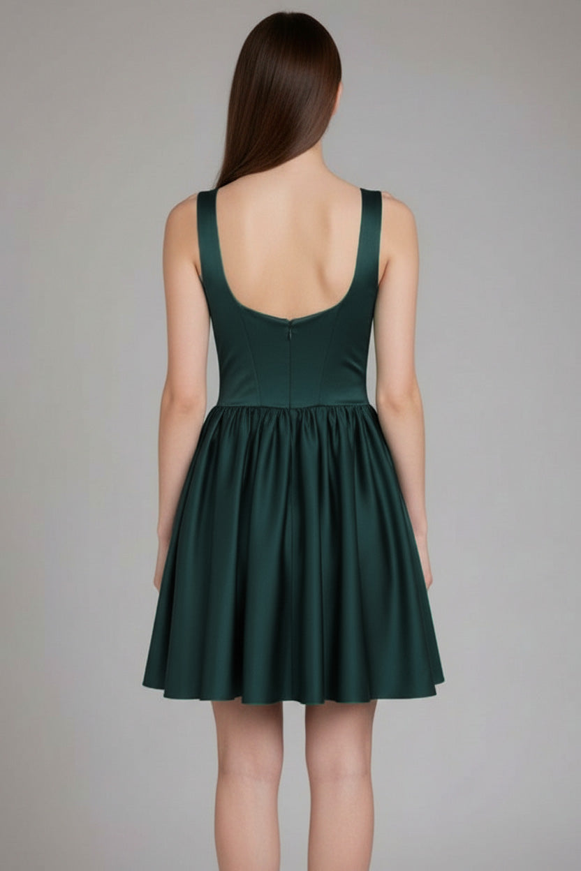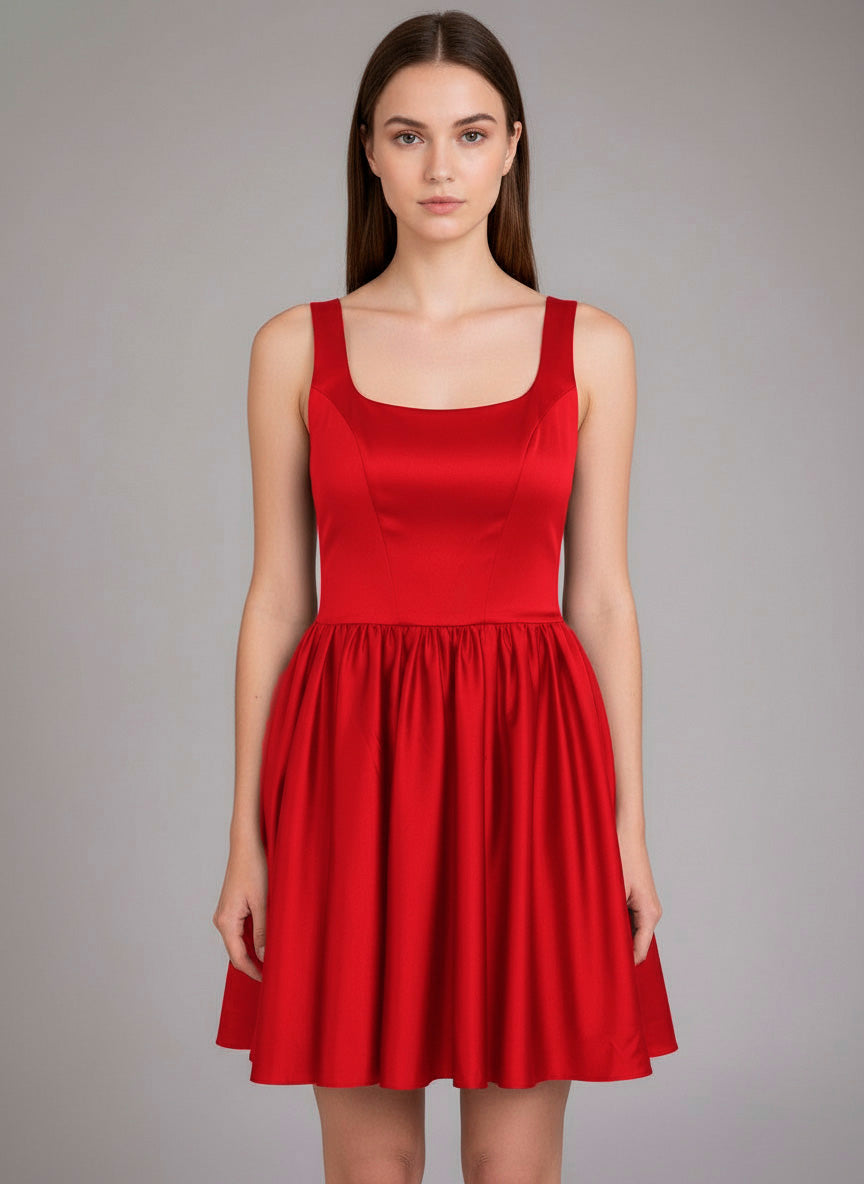 2409 scoop neck satin mini dress with gathered a-line skirt
