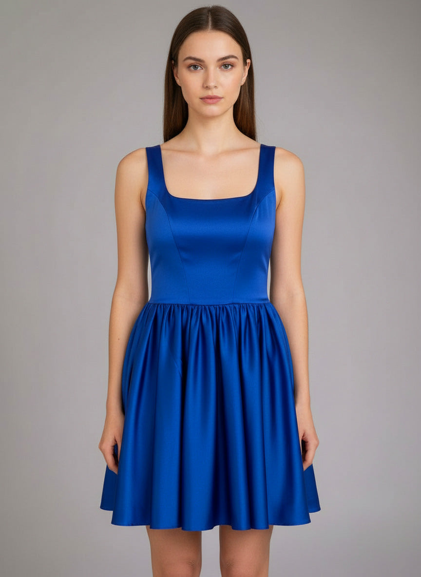 A refined mini dress featuring a structured bodice, square neckline, and softly flared skirt, offering a polished, feminine fit with elegant movement.