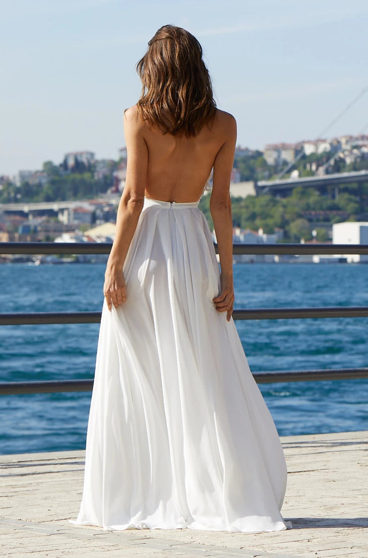 Elegant maxi gown with an A-line silhouette, featuring a halter neckline, sheer embroidered bodice, and high slit for a graceful yet modern bridal look.