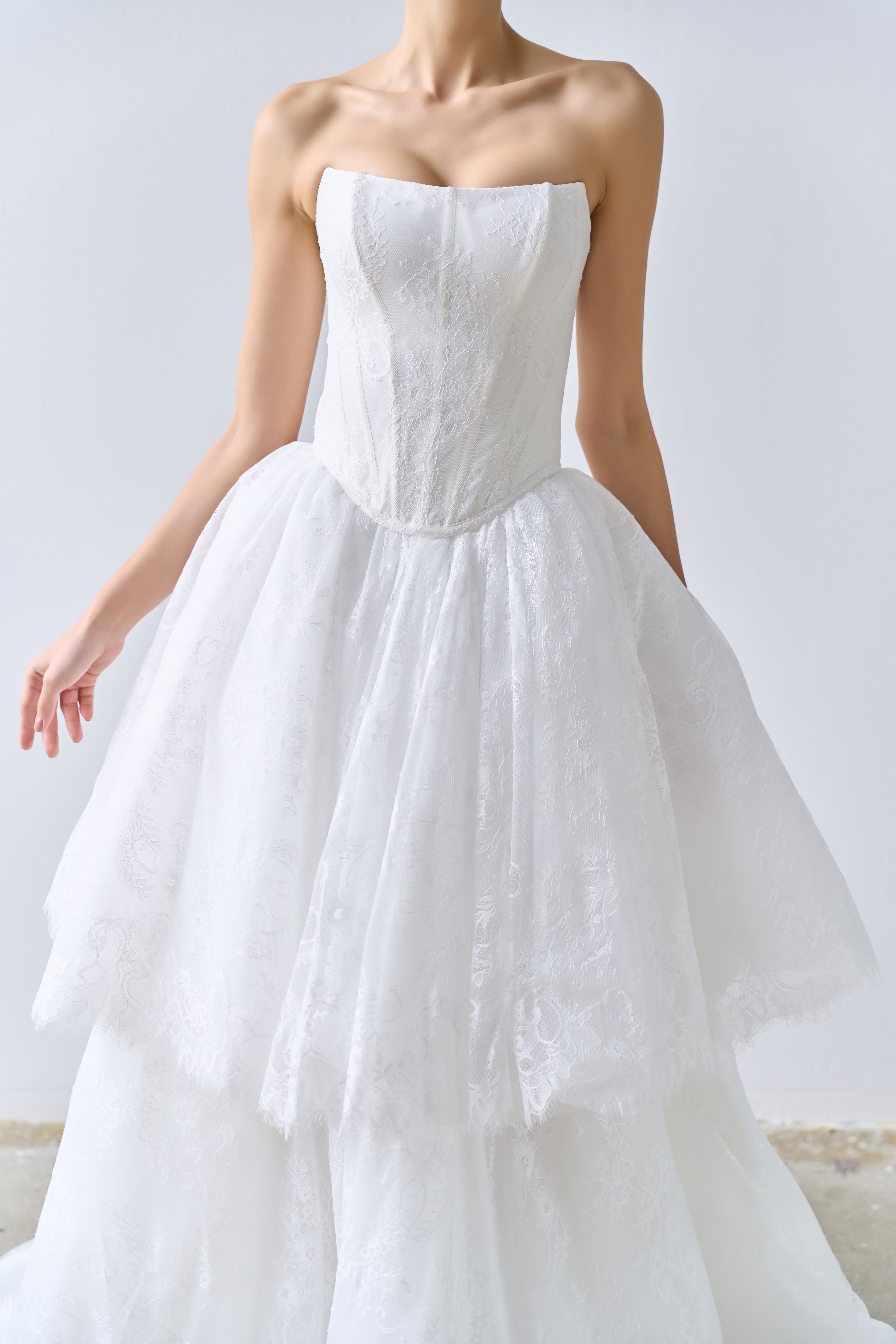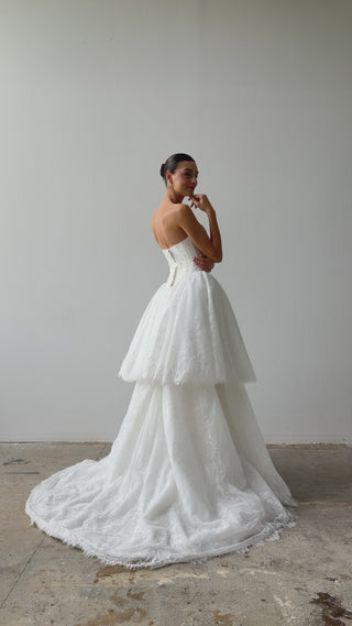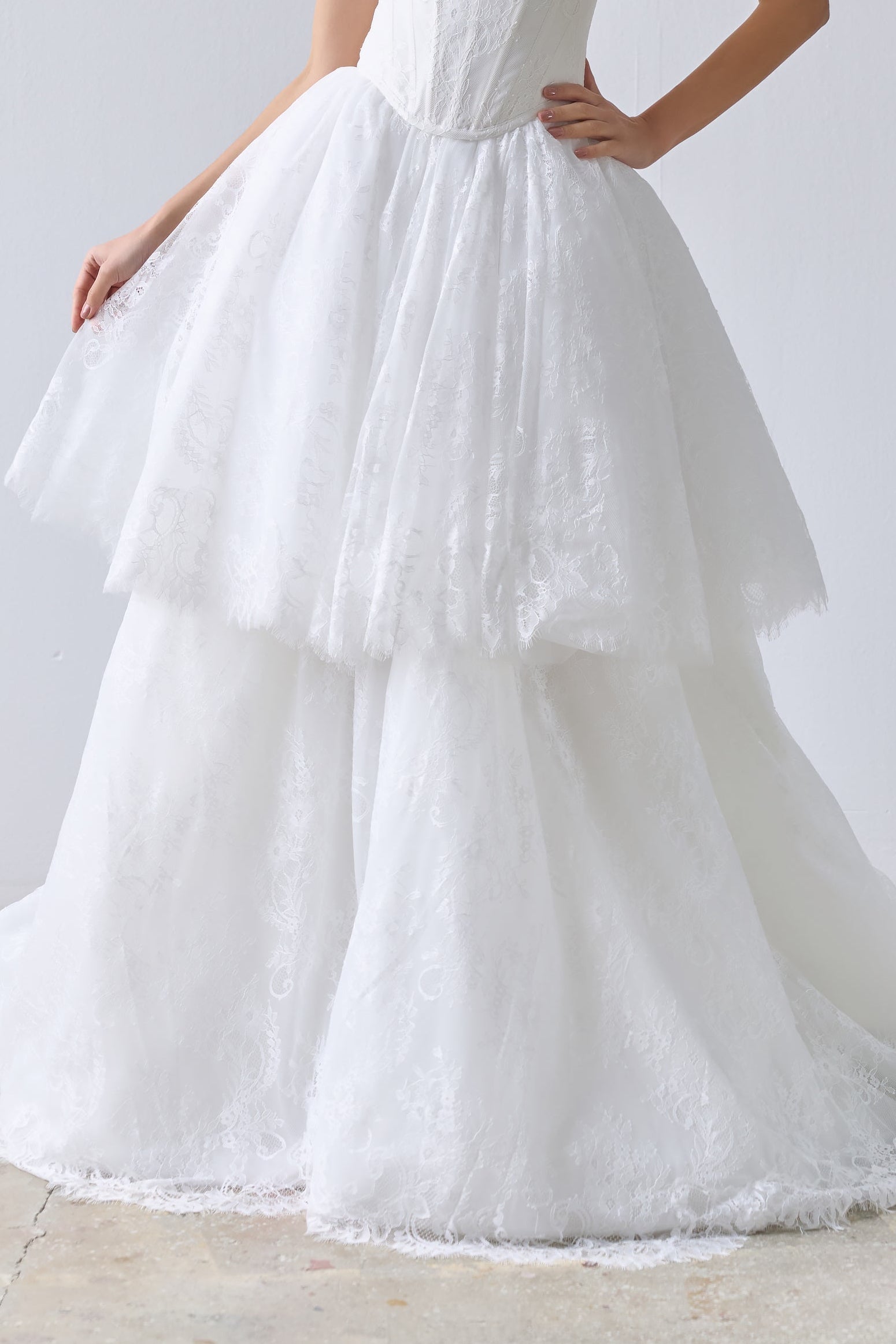 The Dua lace look features a structured strapless corset styled with a sculptural double-skirt combination. Each component is sold separately, allowing brides to build the silhouette they prefer.