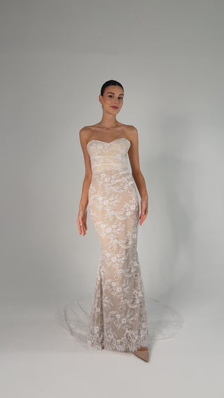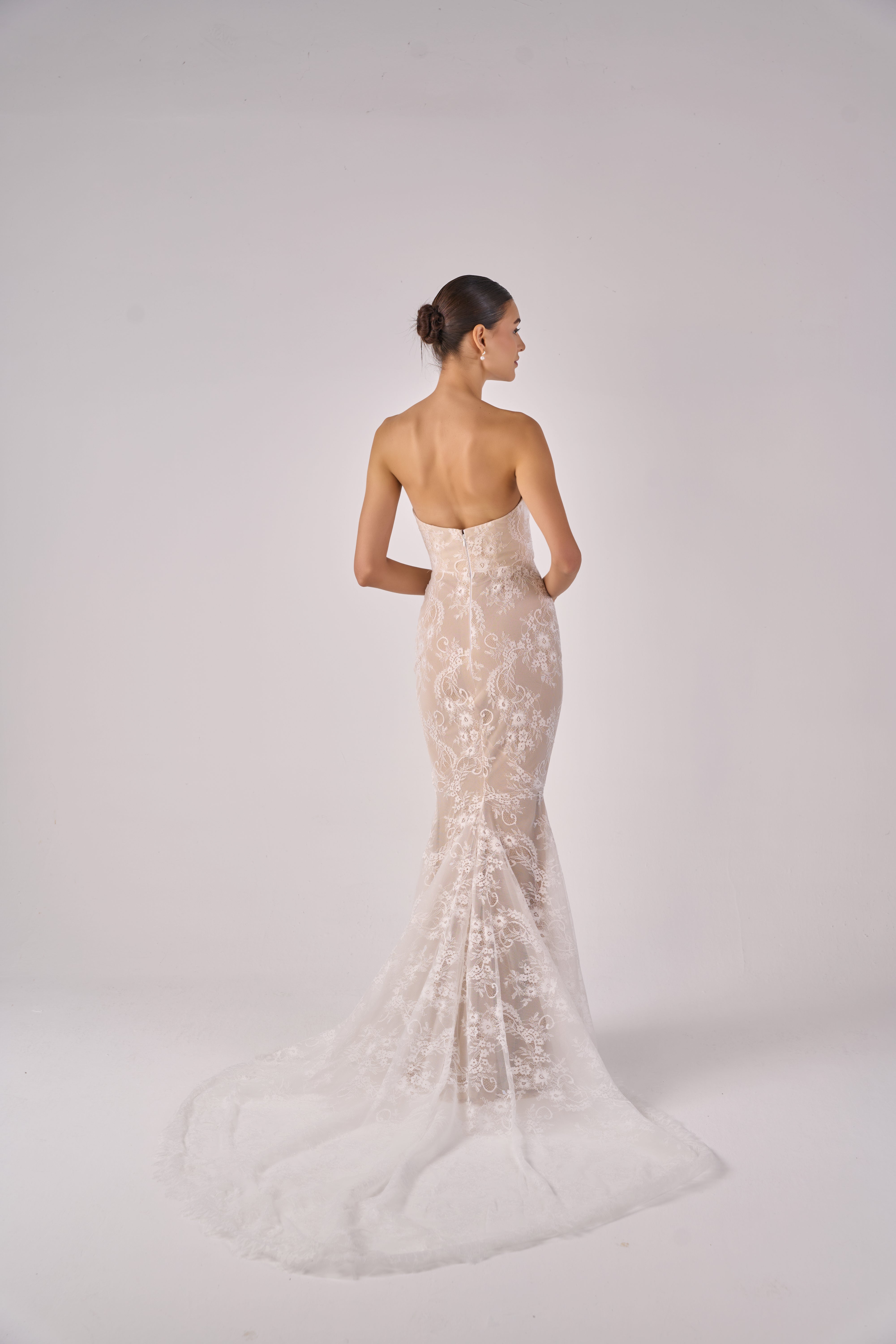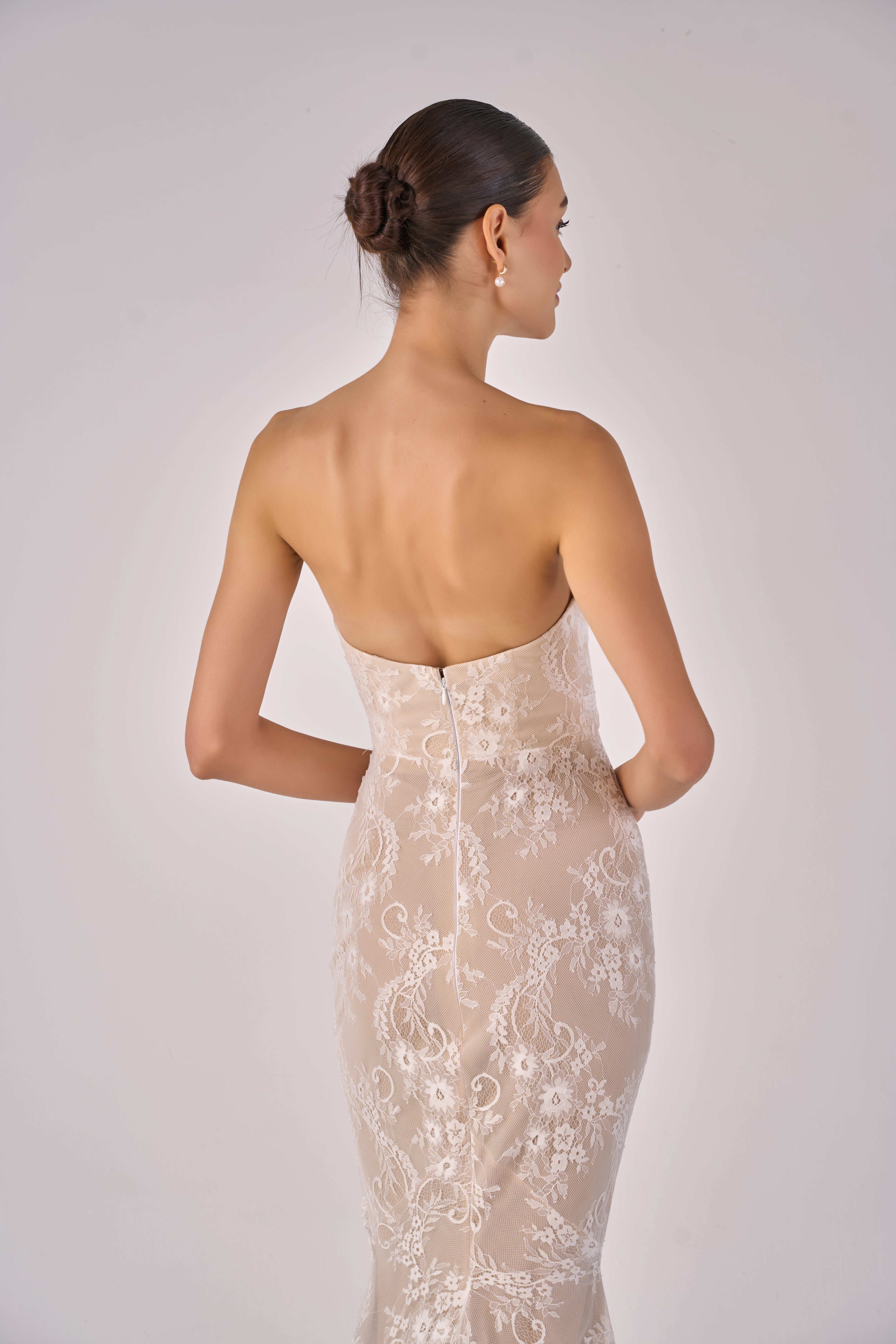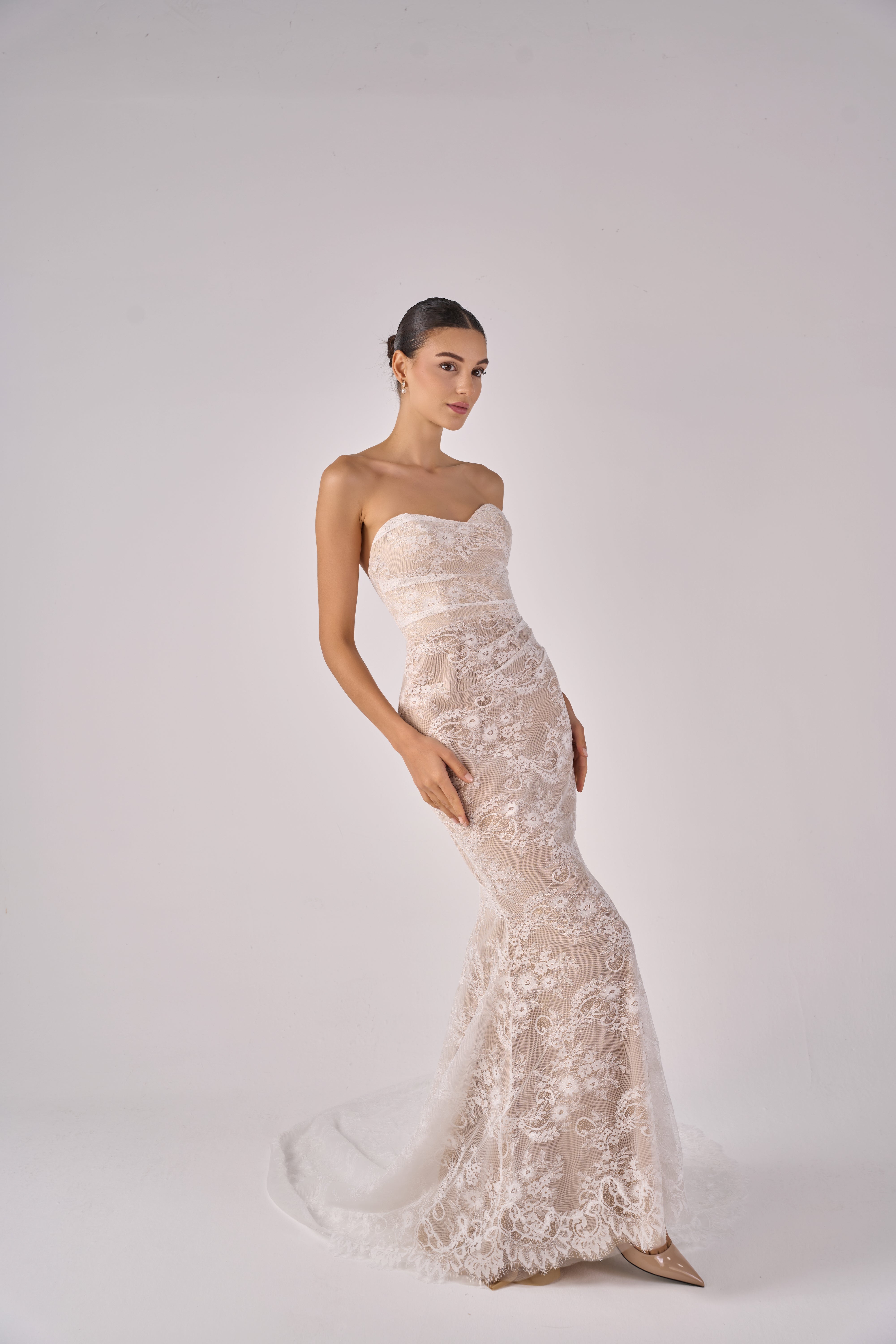 A sculpting lace gown with a fluid mermaid sweep, showcasing a romantic sweetheart neckline and intricate draping that contours the body with refined, timeless elegance.