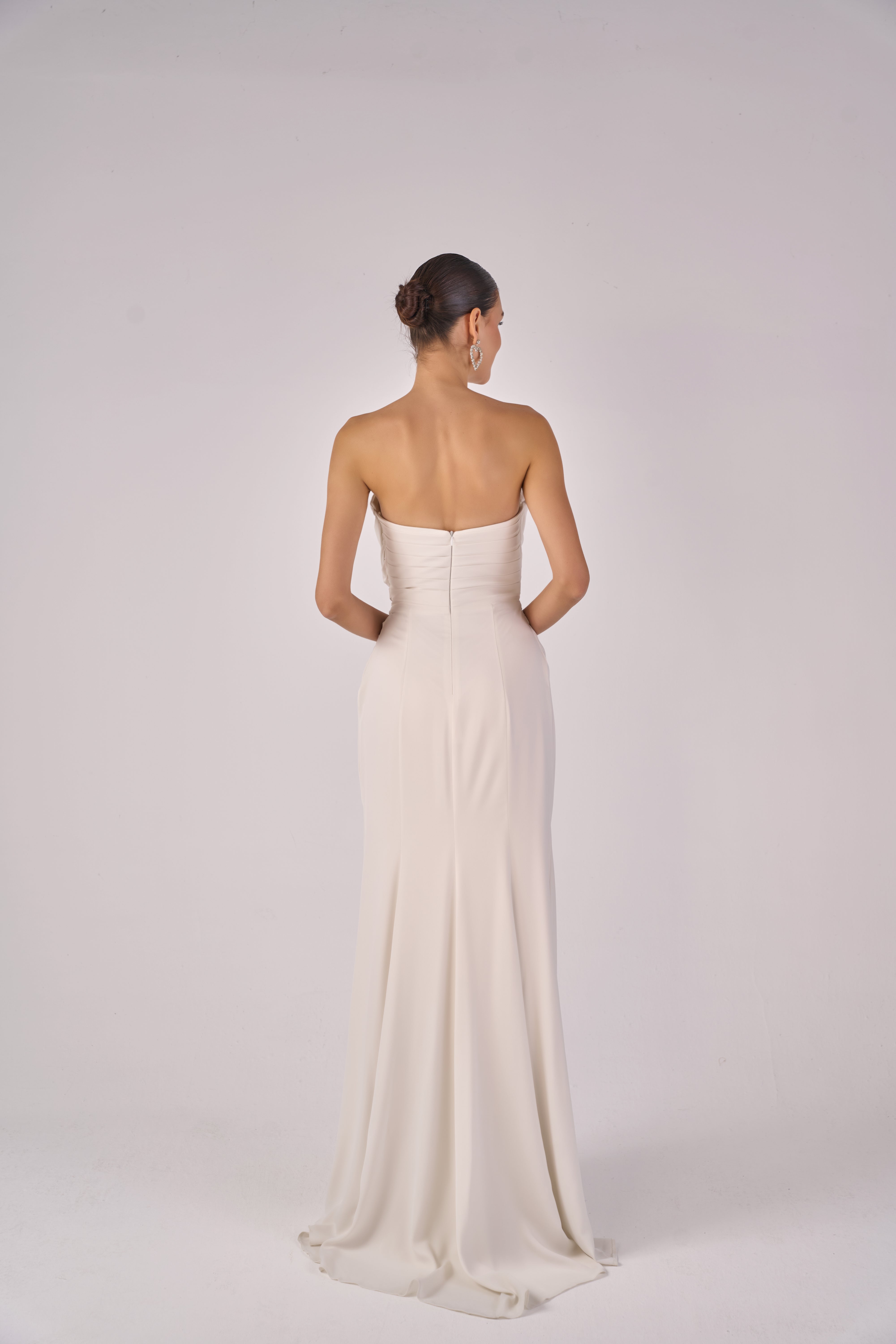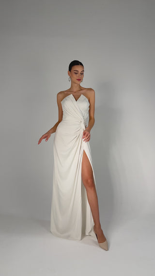 A fluid, sculpted maxi dress featuring elegant draping at the side, a refined strapless neckline, and a sleek column fit that delivers effortless modern luxury.