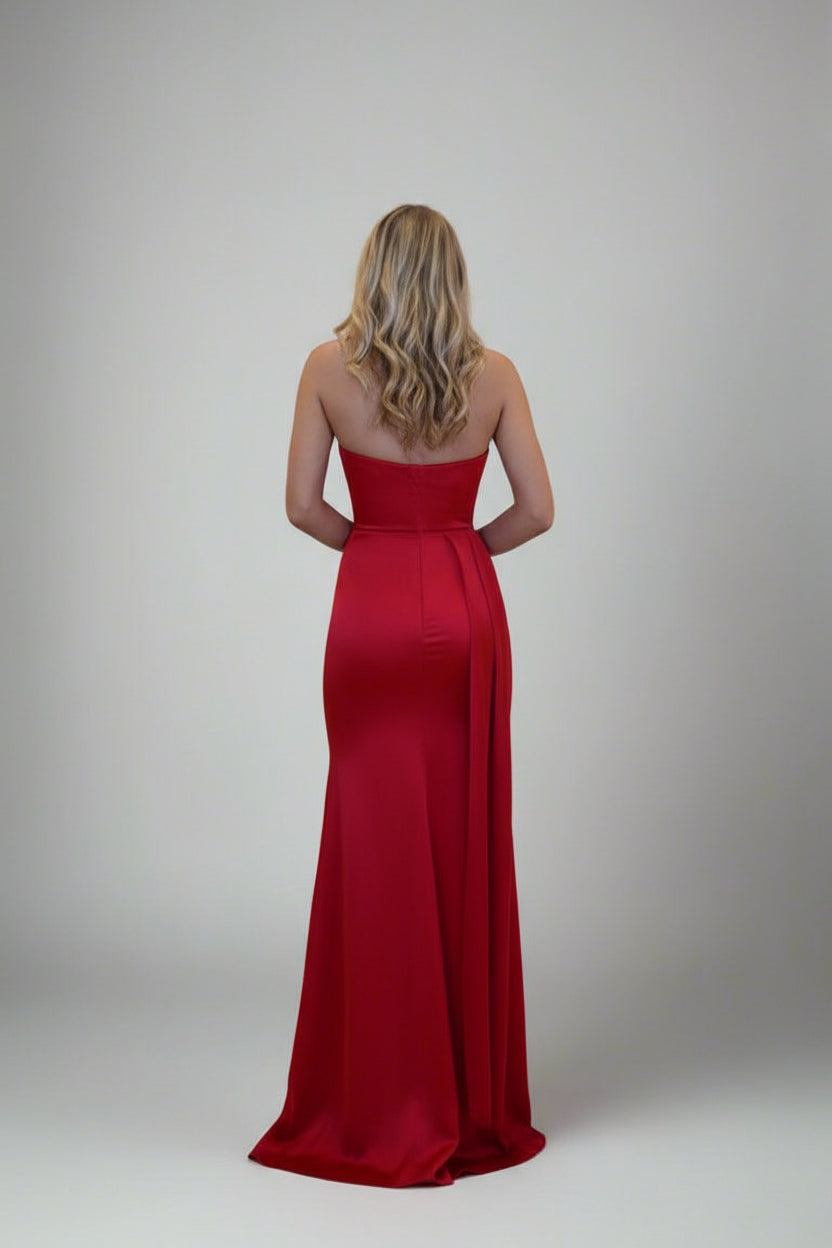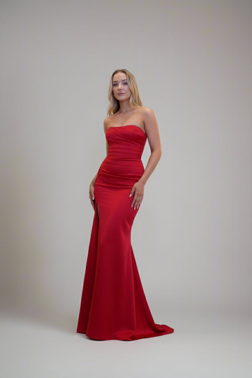 The Kimmy strapless corset gown showcases a sculpted fit with flattering ruching, a daring thigh-high slit, and a flowing sash accent that exudes modern sophistication.
