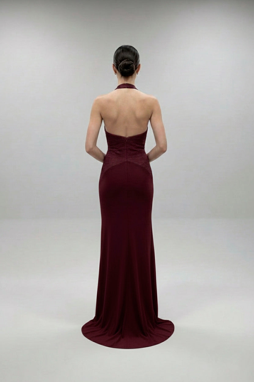 The Elera evening gown exudes sophistication with its artfully ruched bodice, deep V-neckline, and sleek crepe column skirt. A flattering, floor-length silhouette crafted for a statuesque, sculpted fit.