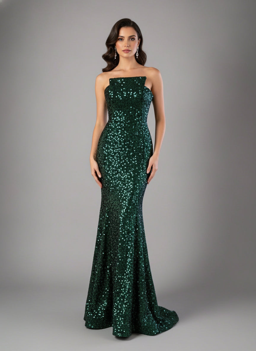 A sculpting strapless gown with a high straight neckline and floor-length column silhouette, finished with a fluid fit that elongates the body and delivers refined, red-carpet elegance.