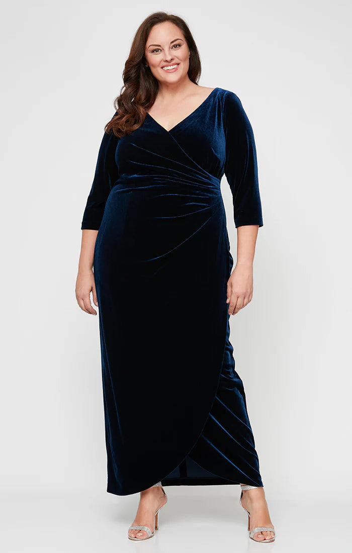 A luxurious long velvet gown featuring a wrap neckline, three-quarter sleeves, and a figure-flattering draped silhouette perfect for elegant evening occasions.