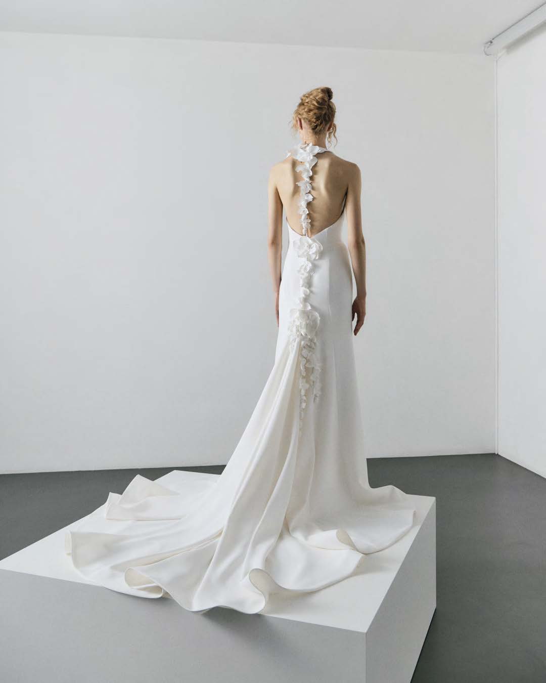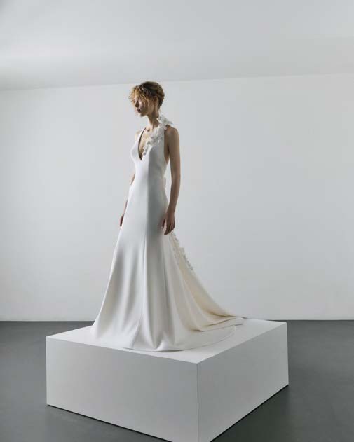 Elegant stretch crepe mermaid gown adorned with handcrafted glycine vines blooming along the plunging neckline and delicate T-strap back. Crystalline florals cascade into a dramatic flowing train.