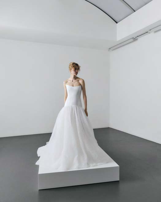 Luxurious satin bodice paired with a delicately textured tulle skirt for a refined couture contrast