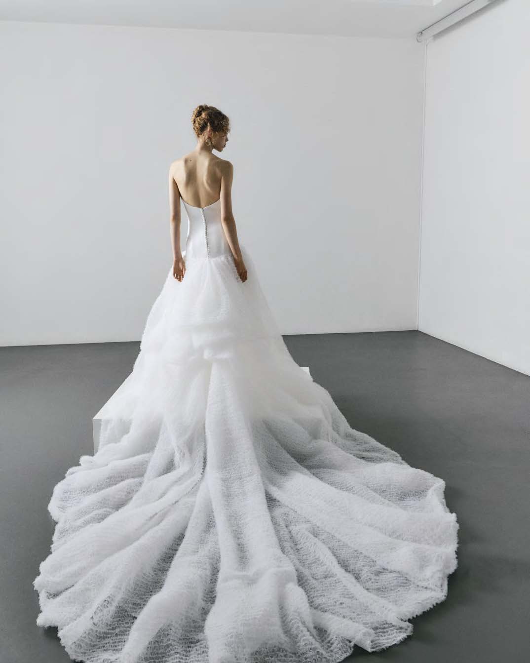 Full skirt cascading into a sweeping, statement train with fluid movement