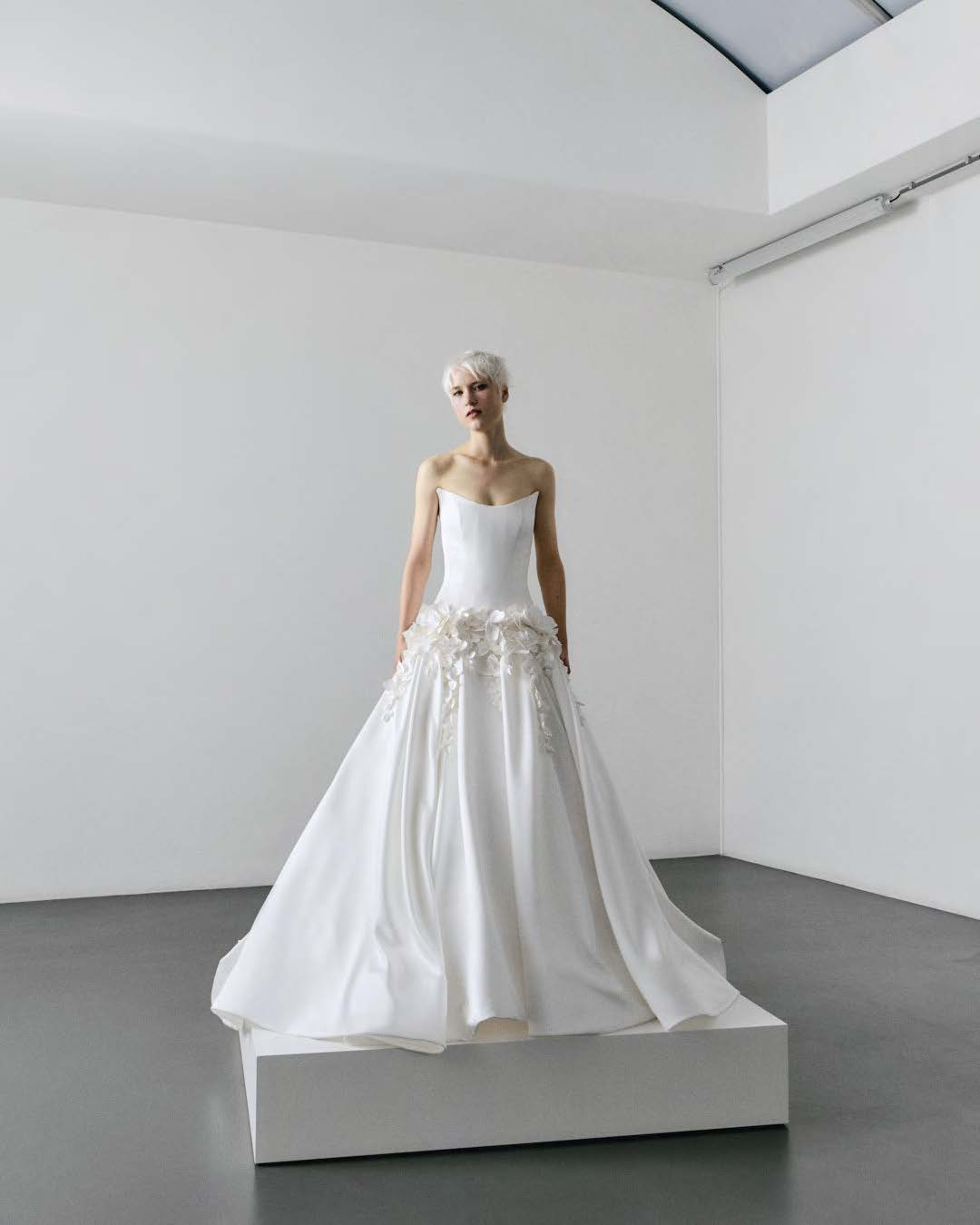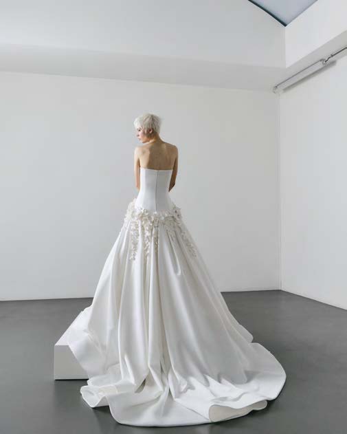A romantic satin gown with a sculptural cat-eye neckline and dropped waist. Handcrafted glycine-inspired florals with crystal droplets bloom across the A-line skirt, embodying Viktor&Rolf’s couture artistry.
